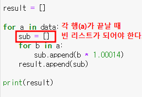 마지막으로, result.append(sub)를 이용하여 sub 리스트를 result 리스트에 추가합니다. 이 과정을 모든 원소에 대해 반복하면 data 리스트의 모든 원소에 1.00014를 곱한 결과가 result 리스트에 저장됩니다.