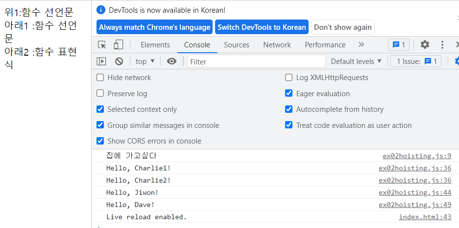 // 그러므로 함수 정의 후 함수 호출하는 순서를 잘 지켜야 한다.